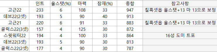 순위를 통해 보면 고근22, 데브22가 엔드 템셋팅입니다